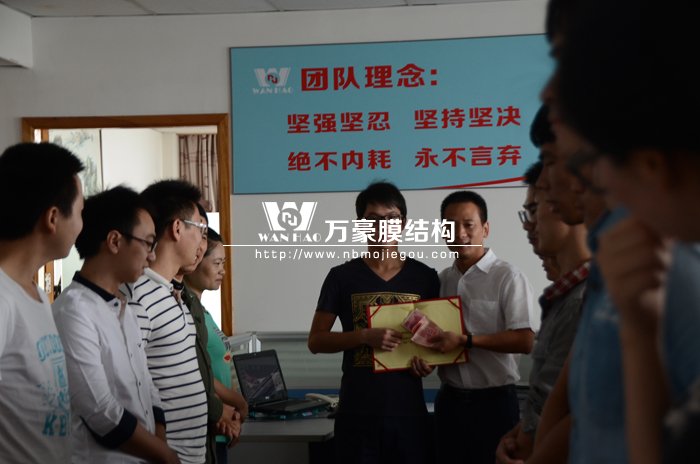 9月16晨會上,公司對項目部阮經理進行表揚,阮經理在工程管理上認真負責,得到業主的好評,阮經理管理施工的上海閔行區第五中學籃球場膜結構工程獲得業主單位上海九星建設工程公司的大力贊揚,并且頒發了“施工優秀獎”的榮譽證書,表揚了我司在施工中組織嚴密、服務優良、管理到位。為表彰優秀,公司在晨會上對阮經理進行現金獎勵。
