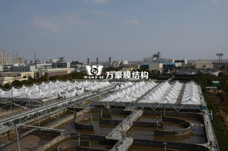 寧波北區污水處理廠廠址位于鎮海新泓口甬舟高速與化工區主干道交叉口附近,污水廠一期建設用地15.48公頃,膜結構張拉膜加蓋面積達一萬多平方米。