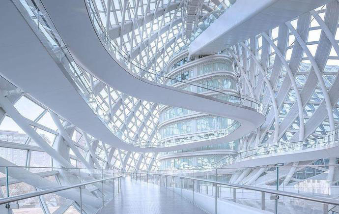 走進這座張拉膜結構建筑,斜向鋼柱形成的韻律在環形坡道映襯下產生了強烈的音樂感。兩柱之間的玻璃幕墻設計成漸變的平板玻璃箱體,插接組合準確,層層疊疊,晶瑩剔透,而在底層入口處的大門洞立面玻璃箱體轉成吊頂。走進其中,周圍的幕墻鋼構弧線順坡而下,向中心匯聚。曲面玻璃和墻板界面的順暢圓滑,板縫的連貫順直,各種設備口部的整合和控制等等都完美地契合在一起。