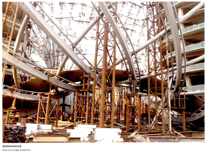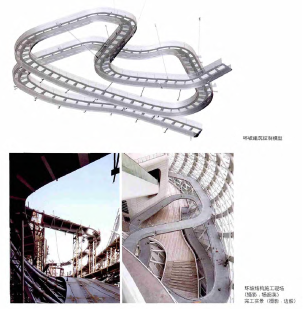 在爬升過程中,“夢之橋”先后與外殼鋼結構、主樓及裙房混凝土結構產生搭接關系,同時還要保證環坡的外型優美流暢。