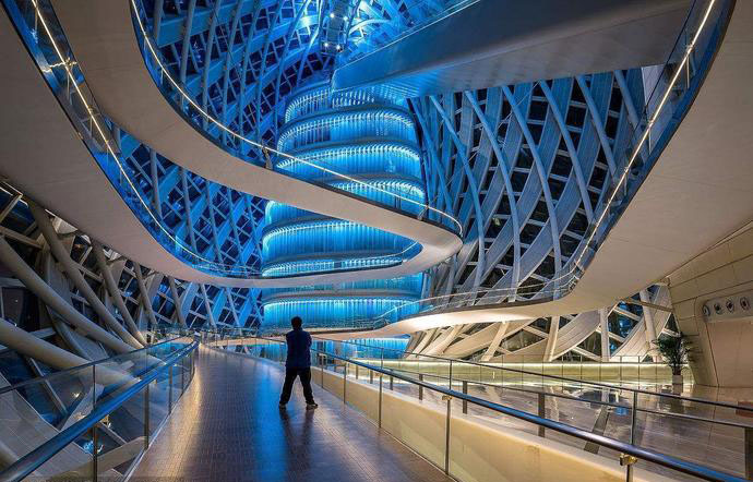 這種“令人捏了一把汗”的設計貫穿在鳳凰中心設計始終。“夢之橋”連接的是演播廳和一個樓頂空間。當大樓設計完成,“樓頂”開闊的地板被連續的莫比烏斯環外殼覆蓋。設計師靈光一閃,決定將這里設計成一個完全對外的開放區域,創造全新的交流場所,取名“樓外樓”。