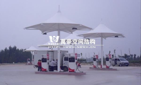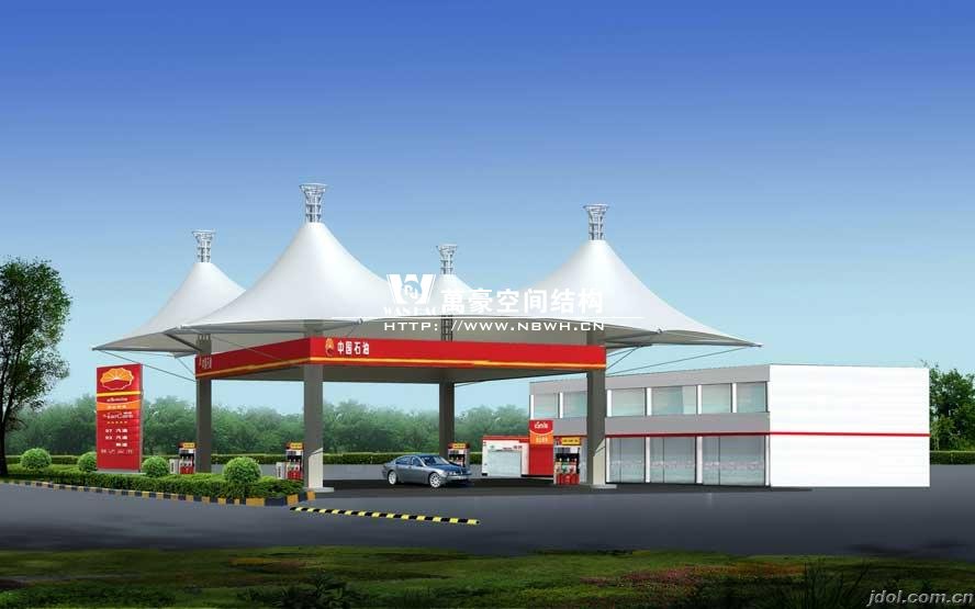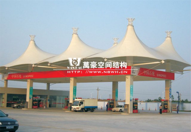膜結構建筑因其獨特的藝術性,優美的造型,濃郁的現代氣息,被廣泛運用到建筑領域的各種設施。加油站膜結構運用在加油站頂蓬上是再合理不過的選擇,因為加油站的頂篷是公路或地區設置名稱標牌的主要位置,是公路或地區的重要標志;大跨度的膜結構在這種場合下的運用,能充分體現膜結構的主要特點,并有較好的標識招攬效果。為相關的道路或區域起到畫龍點睛的作用。