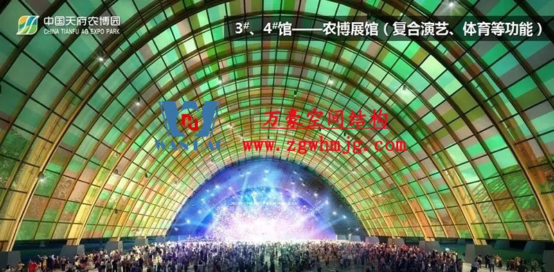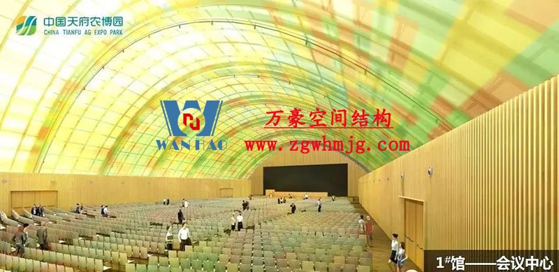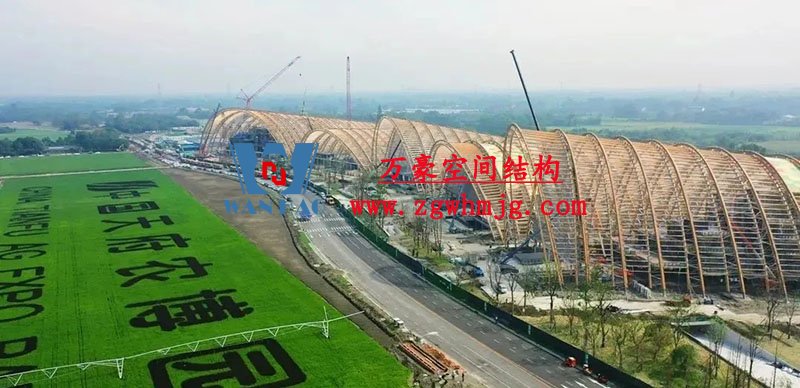 主展館項目采取世界首創的鋼木混合空腹桁架拱(鋼木結構),整體為CNC加工木拱+單層ETFE 膜結構體系,這座長在田野中的巨型建筑,在工程技術上運用了許多在成都,乃至國內都少見的高新技術、高級材料。