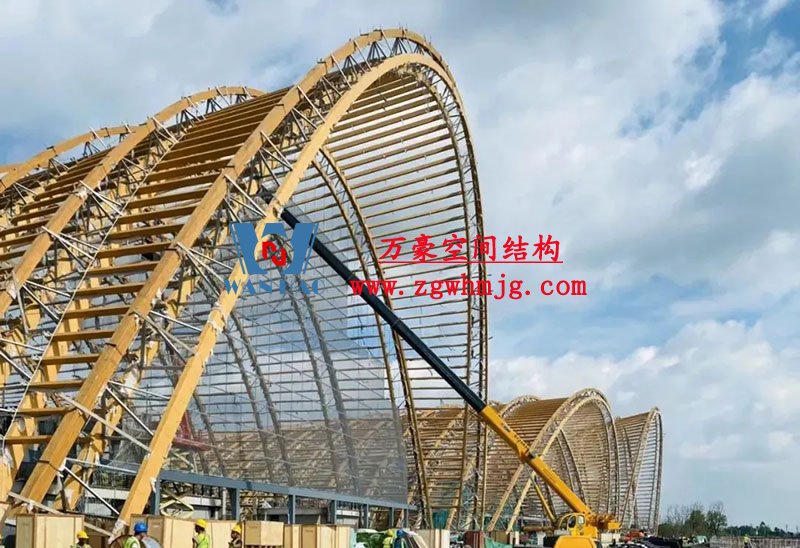 農博主展館項目五個館,共有77個巨型木拱,跨度高度均不相同,節點類型繁多,設計難度大。其中最大一拱跨度為118米,最高為43.25米。目前天府農博主展館項目已經雛形初現,遠遠望去,猶如稻浪翻涌起伏震撼人心。