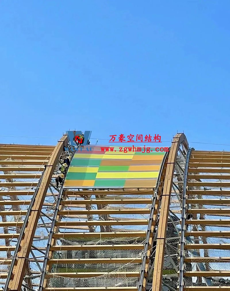 屋面為德國進口ETFE膜,這種膜的承重能力強,僅僅0.25毫米的厚度。膜片數量多、顏色多,通過采用參數化建模技術、加工圖數字化自動出圖等措施,達到設計規則統一、安裝快捷高效的效果,最終呈現五彩斑斕的表面,表達積極、健康、豐收的景象。