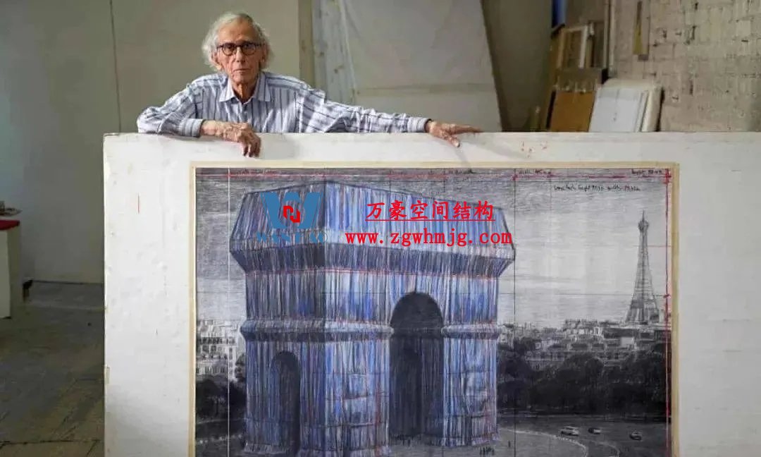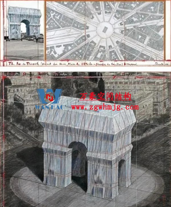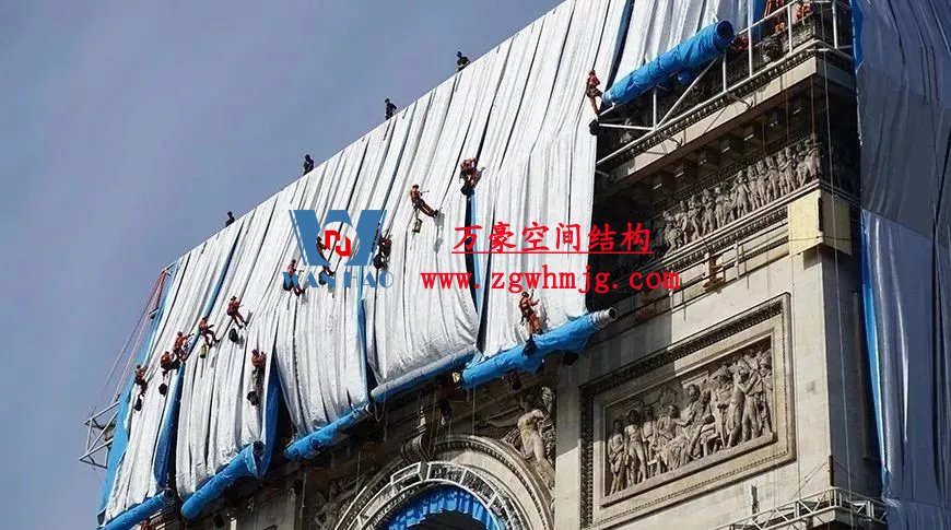 下部結構于今年八月底在凱旋門上安裝完成,其中包括雕塑、飛檐和裝飾物前的鋼桁架結構、用于固定預應力索的轉角構件和木質箱形結構,以及屋頂的懸挑梁支承結構。由聚丙烯網格布制成的波光粼粼的藍色織物從屋頂懸掛而下。70多名“蜘蛛人”將成卷的藍色織物展開;然后正如克里斯托的拼貼畫里展示的那樣,再用專用紅繩將織物“系”到巴黎的這座地標建筑物上。