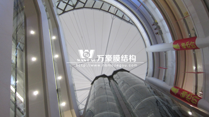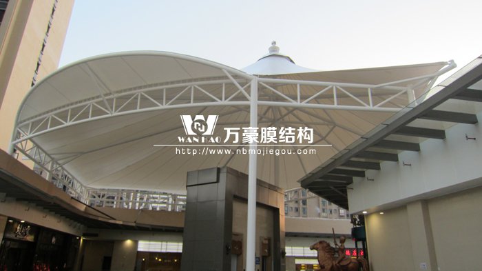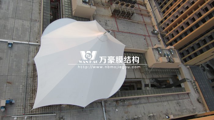 本工程總建筑面積約900平方米,主體一根主柱、九根支柱,四周單片桁架連接,總體一個帽柱,直線長為26.9米,帽柱總高33.6米,寬為27.8米。因為本工程坐落在商業區中心,四周都是五層商鋪,吊車無法進入施工現場,先用25噸吊車把材料送到五層樓房頂,后用人工或手拉葫蘆進行運送和安裝。施工范圍包括鋼結構系統與膜材系統的制作和現場安裝施工,現工程已經完工。