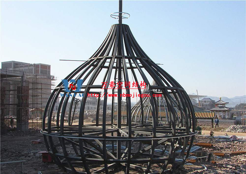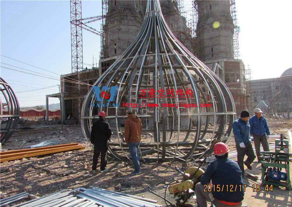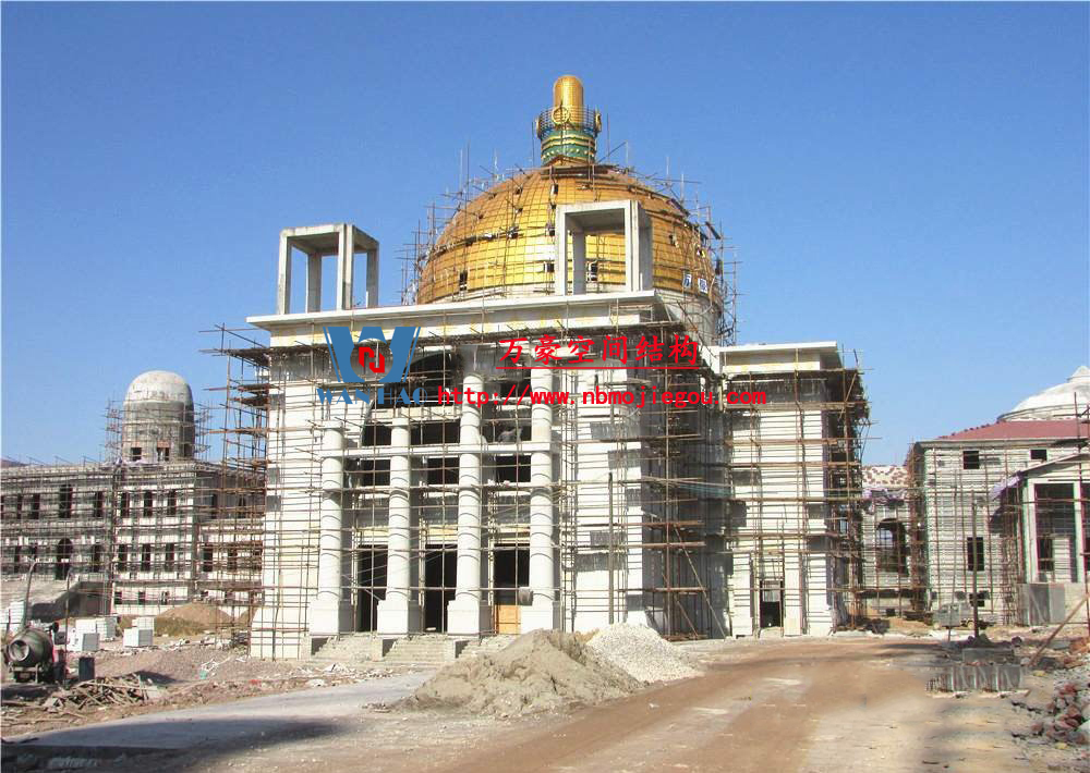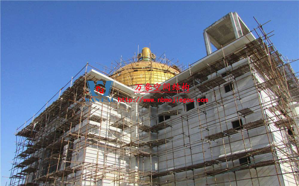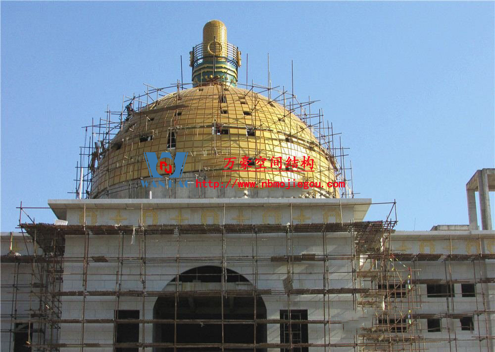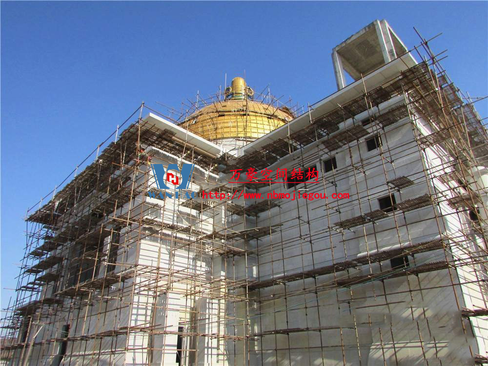 整個穹頂主結構由48根弧形鋼結構勾勒而成,外表面采用8000多塊金色鋁板拼裝完成,由于該項目為圓頂結構,每條緯線部分的每塊鋁板大小各異,因此對主結構加工、安裝精度要求極高,現場以一個平面控制網和48個徑向平面組成控制系統,即以平面代替三維空間,來達到精確、快速的測量定位及校正數據并順利完成施工。