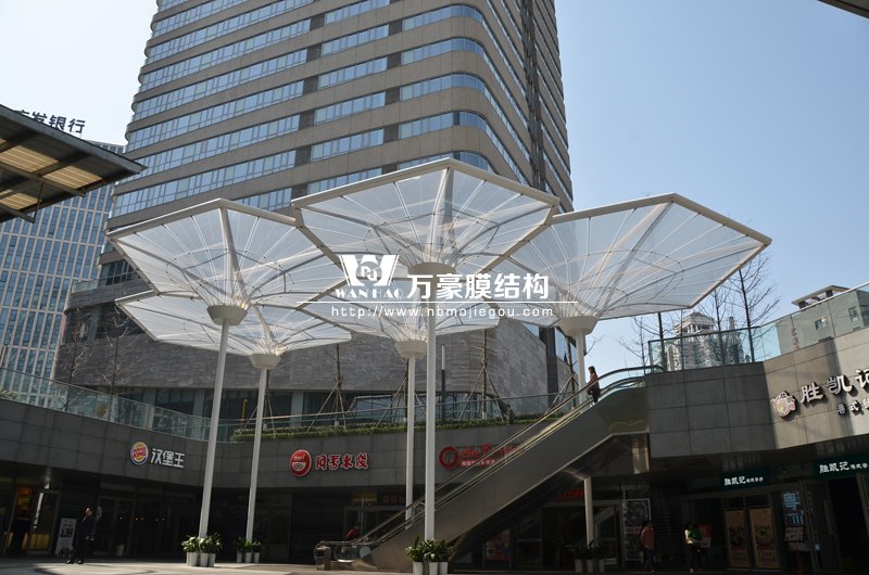 最新寧波商業廣場ETFE膜結構項目,本項目采用先進的ETFE透明膜材,漂亮的水立方外墻就是采用這種膜材。在商業廣場上采用ETFE膜能讓建筑更加美觀,同時ETFE膜使用壽命長,自潔性好,雨水就能沖洗干凈,使得越來越多的商業廣場加蓋使用膜結構。