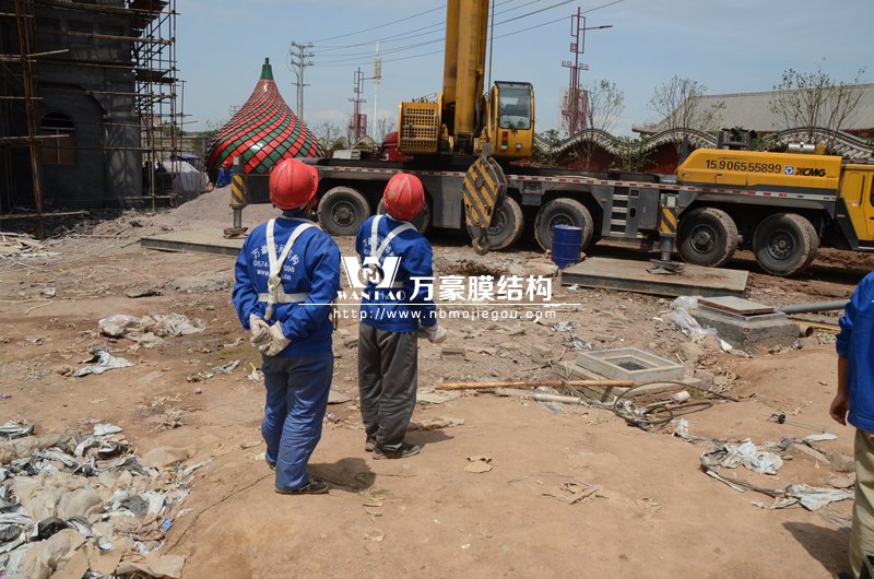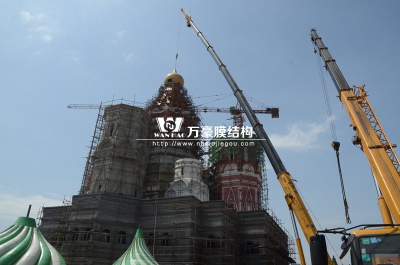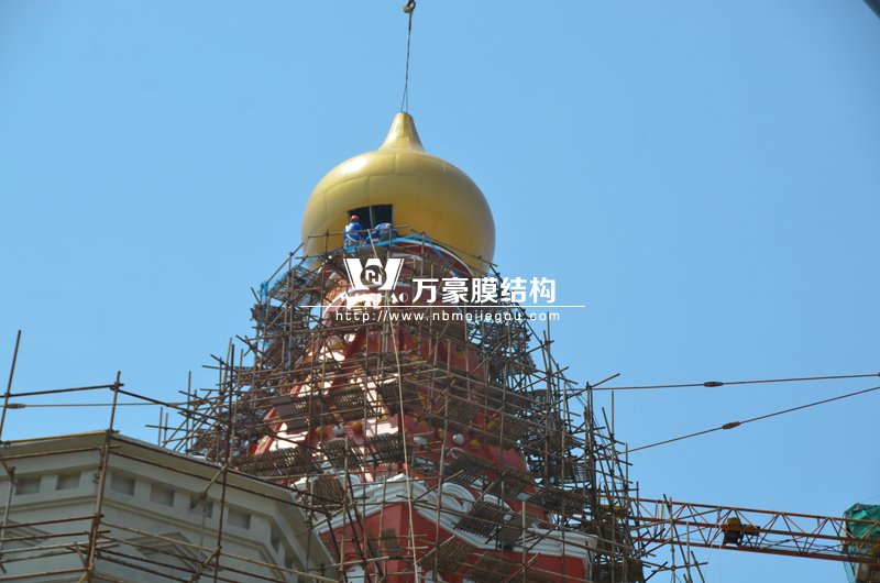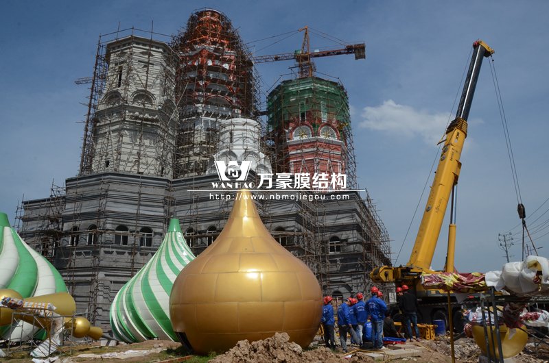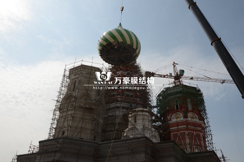 我司承建的橫店影視城圓明新園俄羅斯館已經進入頂部吊裝階段,本次吊裝難度極大,有著重、高、精等特點。本次吊裝的球體采用鋼結構骨架和鋁合金外殼組成,自重很大,同時球體在吊裝過程不能變形,對球體前期的設計制作要求高,因其重量大,所以使用了大噸位吊車。本次吊裝高度高,很多都是高空作業。同時本次吊裝精度要求高,需要球體和底座按照設計要求完美結合,一次性完成吊裝,需要吊裝人員做好協調溝通工作,配合毫無誤差。4月17日天氣晴朗風速低,是吊裝的有利天氣,首先吊裝相關人員設備做好準備工作,之后先吊裝1號球體,在1號球吊裝完畢無誤固定后再吊裝5號球體,當天吊裝好1號球體和5號球體。