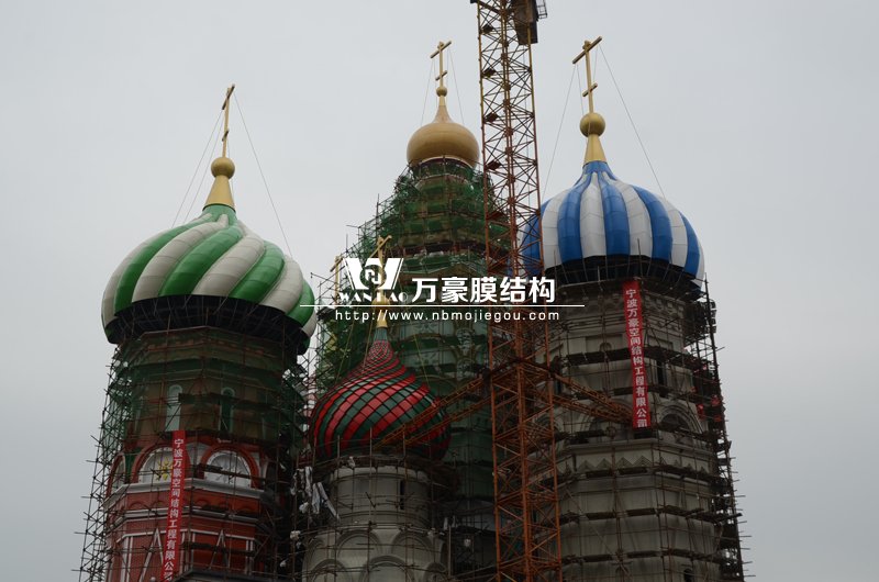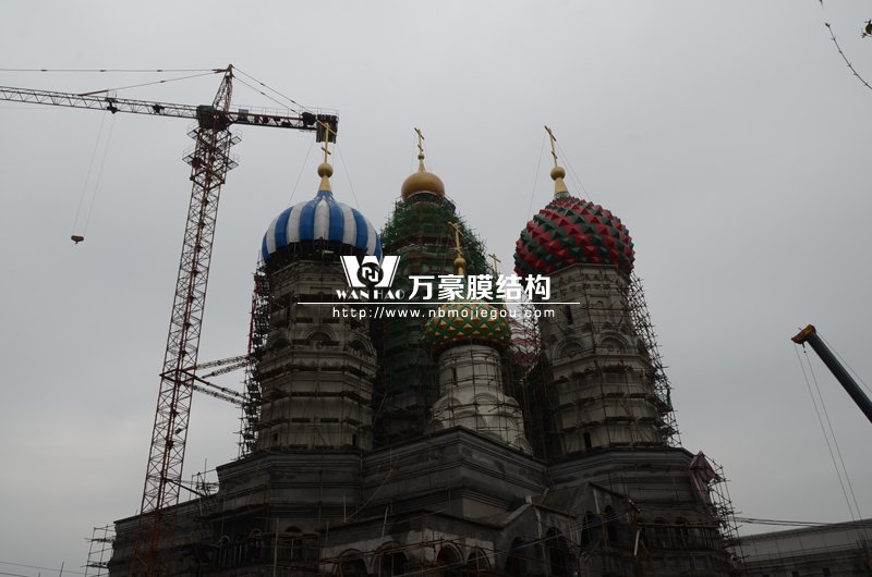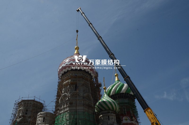 橫店圓明新園俄羅斯館屋頂整體吊裝順利完成,300多噸的大吊車,20多噸重的鋼結構裝飾球,80米高的作業平臺,在萬豪現場管理人員和工人的緊密協調下,經過一周的晝夜努力終于大功告成,本次吊裝從4月17日開始,前期天氣晴朗無風,是吊裝的好天氣,吊裝也是順利進行,之后的幾天陰雨不斷,大家為了吊裝盡快順利完成,在雨小的時候冒雨進行吊裝,終于在4月22日吊裝正式完成。