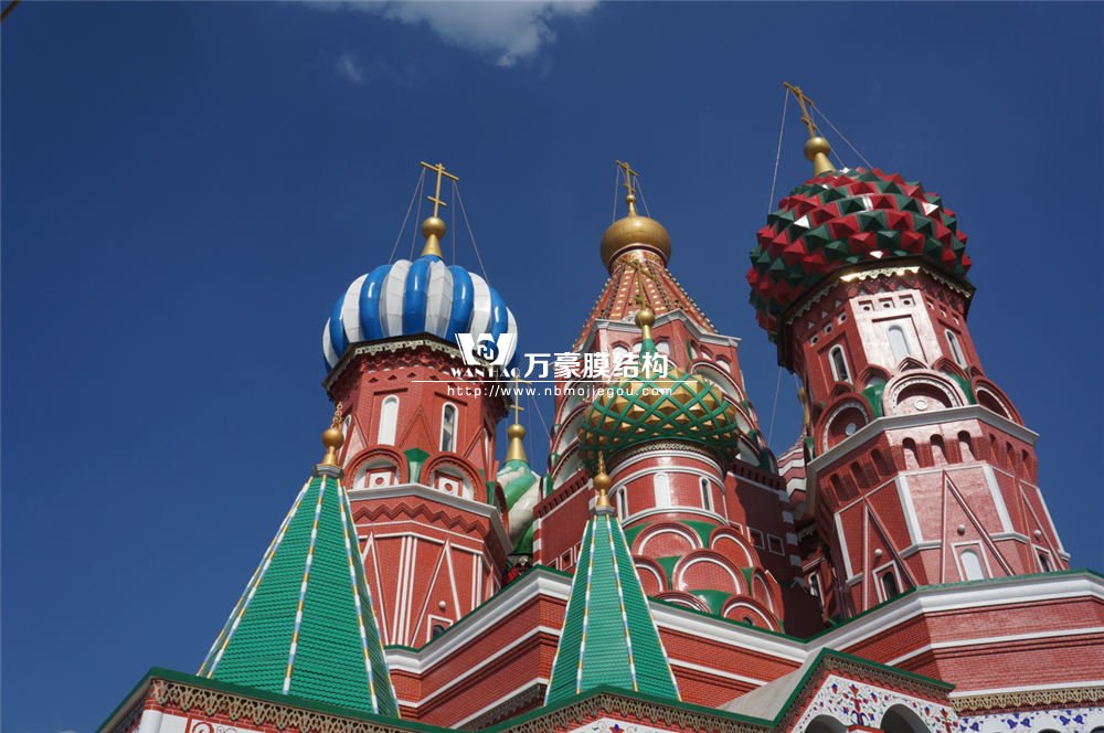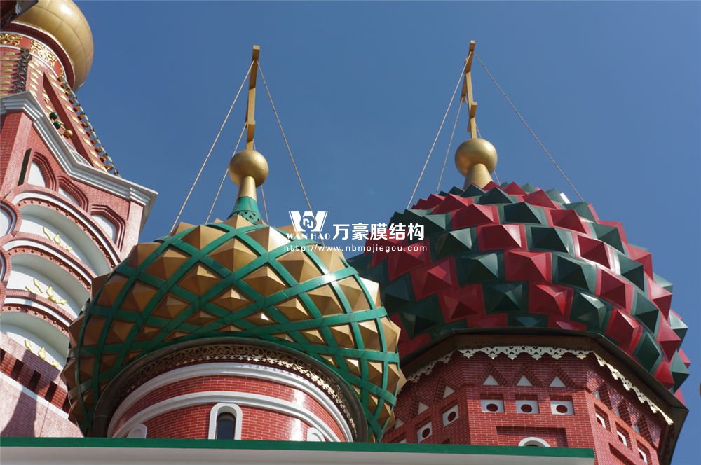 項目坐落于浙江省東陽市橫店影視城圓明新園皇家園林內,金色穹頂標高達61.2米,單個穹頂重量達17噸。穹頂結構充分利用鋼結構異形特性,完美重塑俄羅斯圣瓦西里大教堂的莊嚴宏偉,完美再現圓明園萬國建筑的雍容華貴。