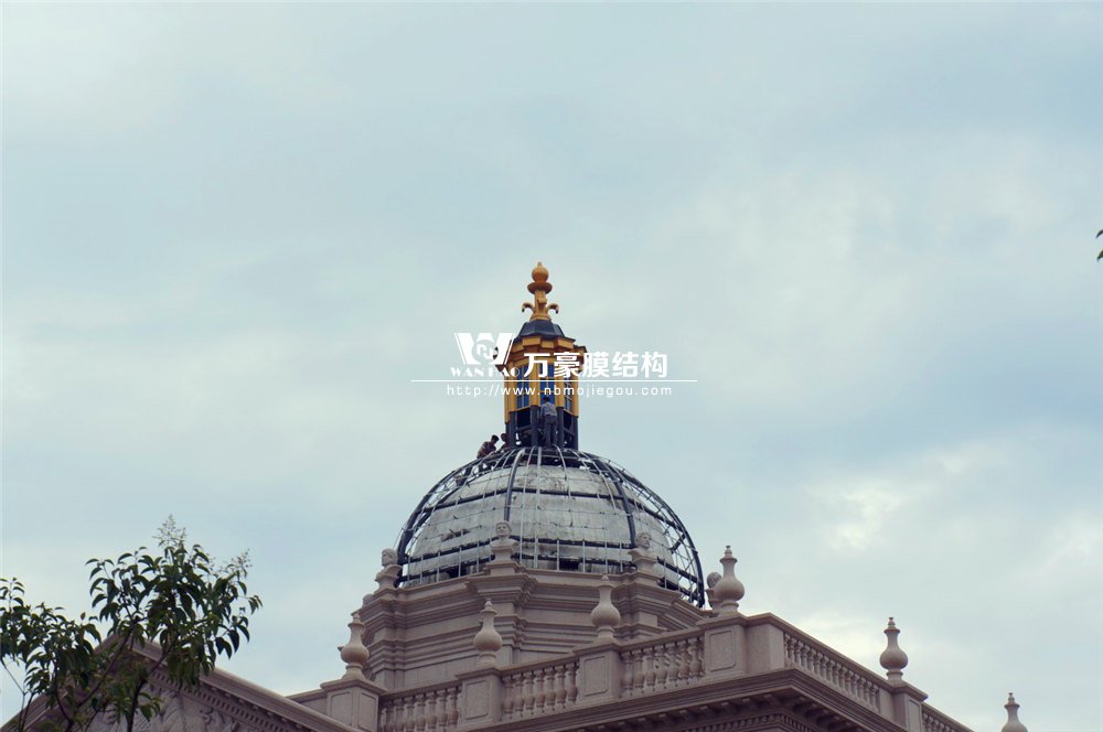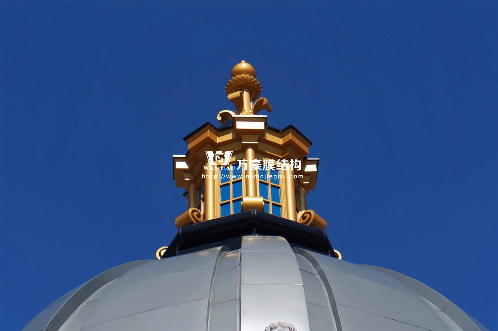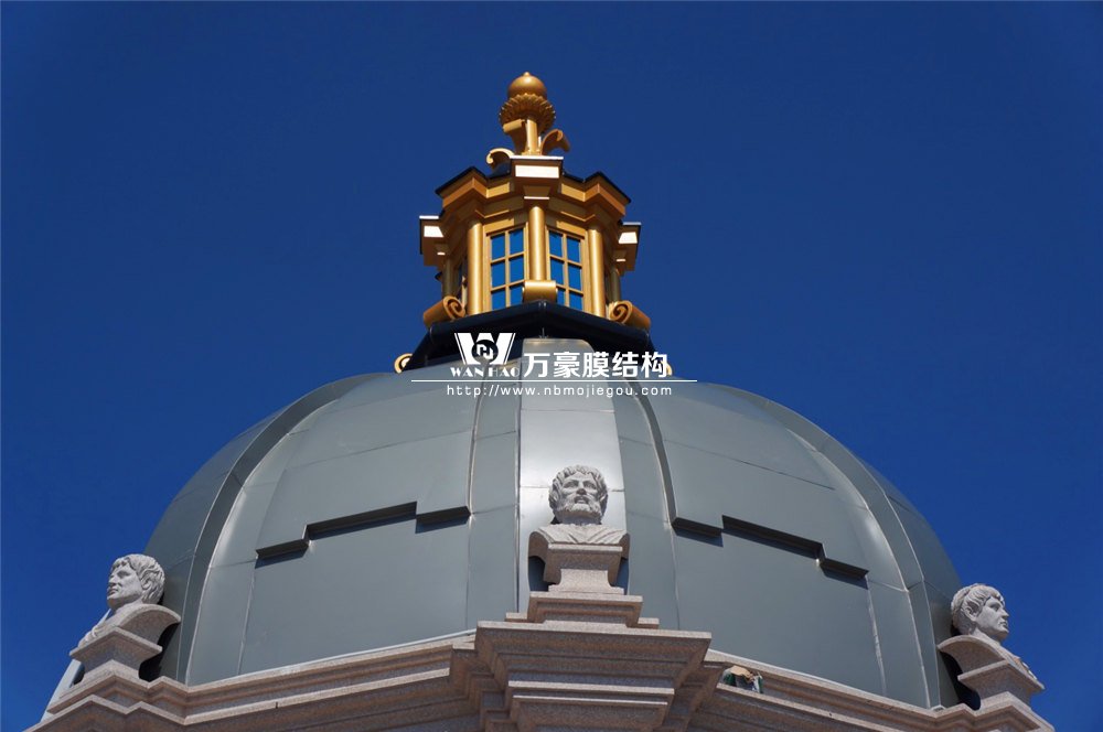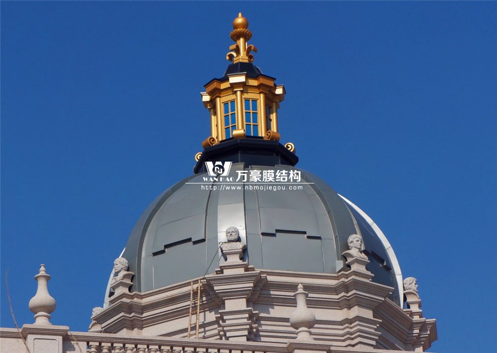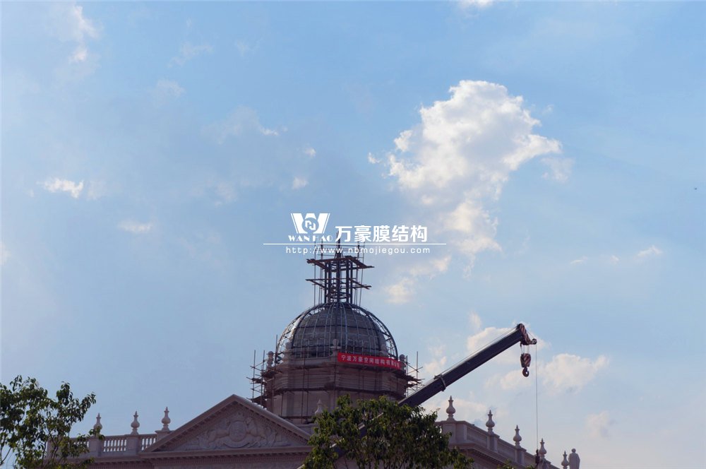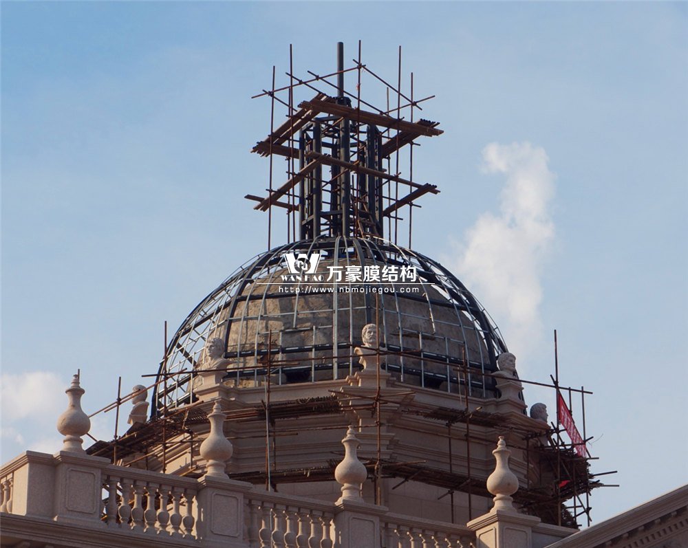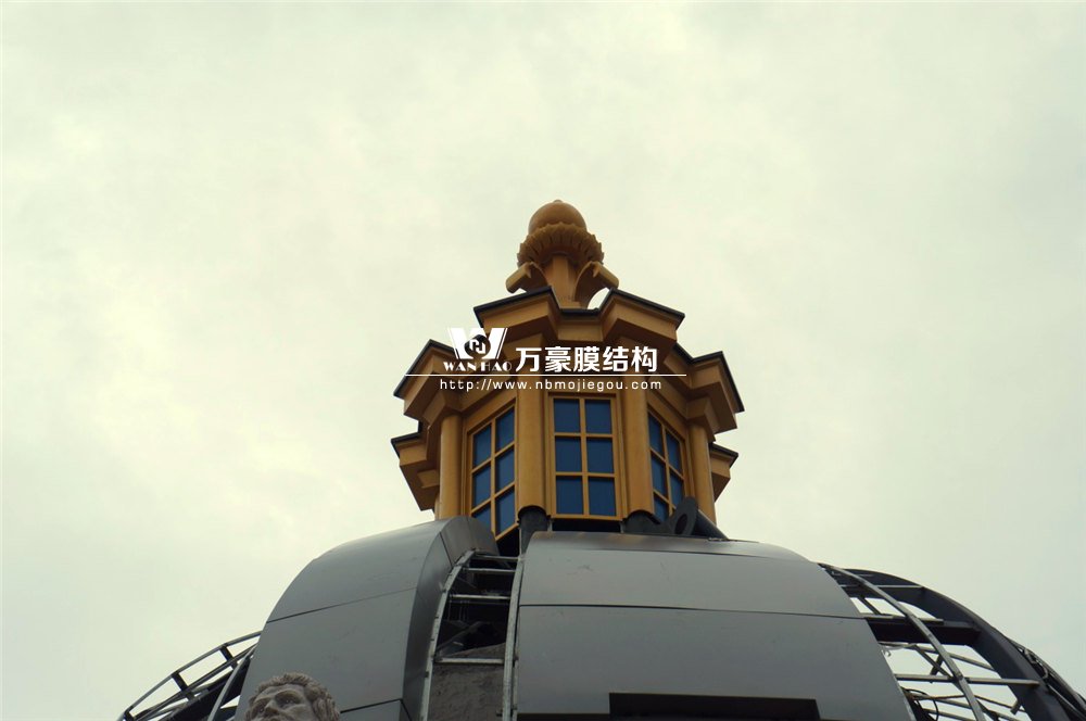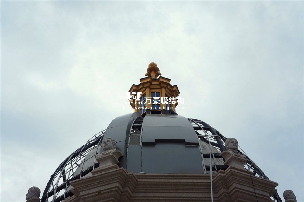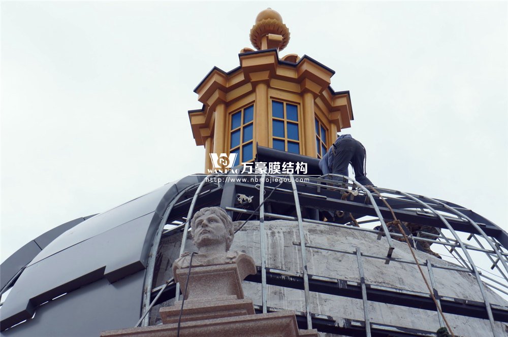 整個穹頂主結構采用弧形鋼結構勾勒而成,主結構外表面依三維模型尺寸焊接彎圓后的次龍骨,完成面采用定制加工的雙曲鋁板拼裝而成。