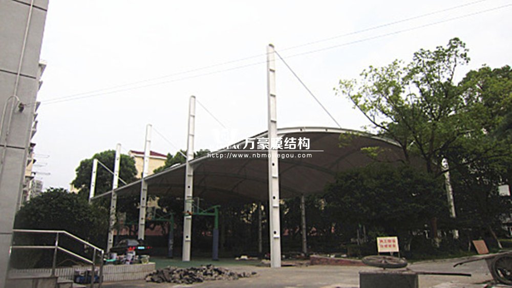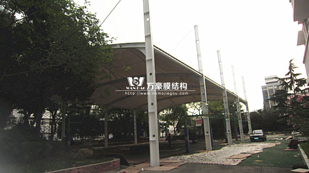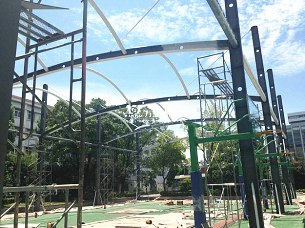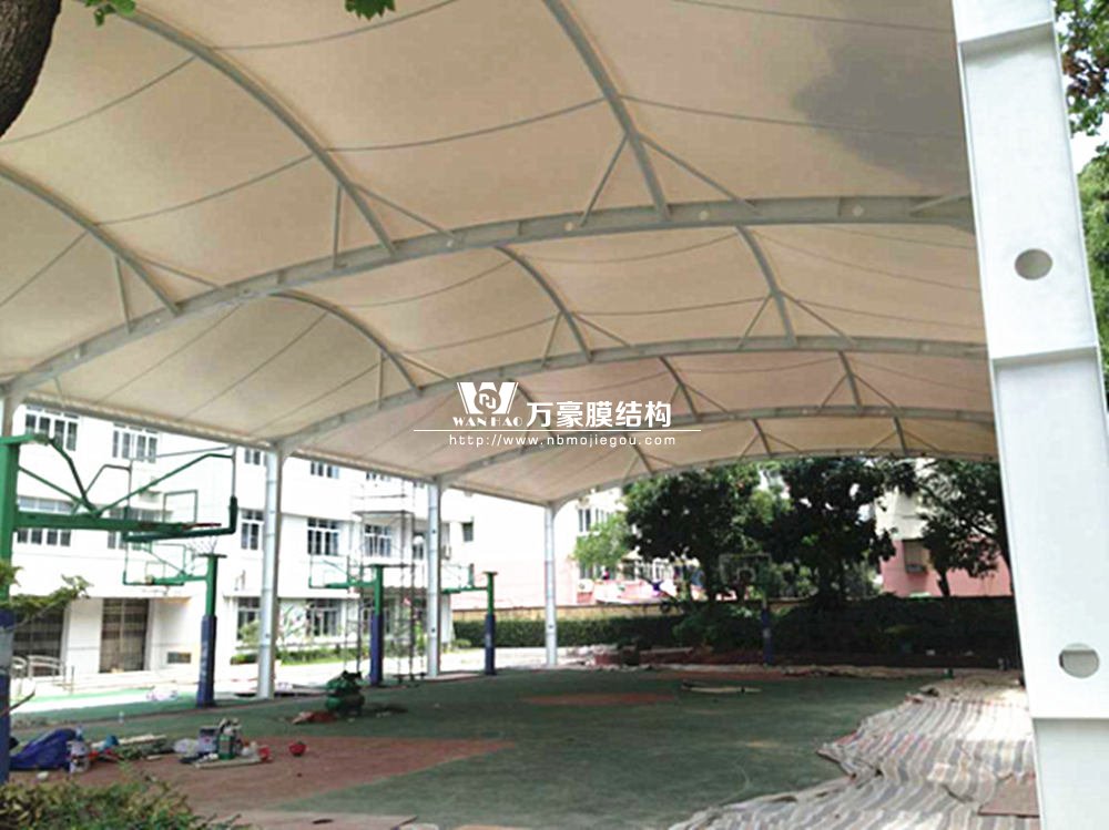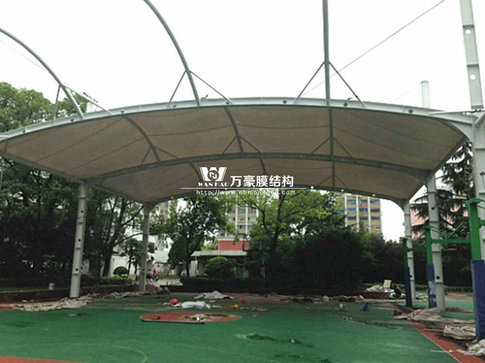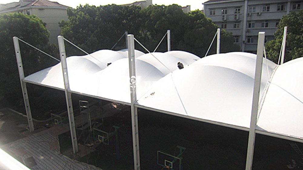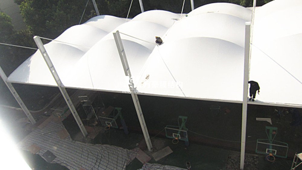 本工程系上海市閔行區第五中學籃球場膜結構工程,位于上海市區閔行區江川路248號東風小區內,該工程為鋼桁架膜結構立體造型,以H型鋼為主要結構的骨架式單層膜結構,上面采用進口普利菲膜材覆蓋。總面積約1000平方米,鋼構約60噸。該工程看似施工難度不大,但是對于一個已經投入使用多年的學校,籃球場地面已有澆筑好的塑膠地面設,成品保護這塊工作是施工唯一的一大難點。用了大批的模板才能保護塑膠地面。工程完工后,受到了好多老師的好評,也得到了總包單位的認可!