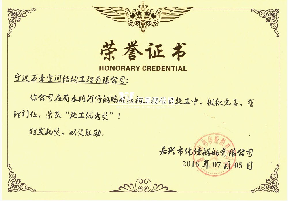 我司承建的浙江麗水內(nèi)河停船塢膜結(jié)構(gòu)工程項目獲得業(yè)主頒發(fā)“施工優(yōu)秀獎”。