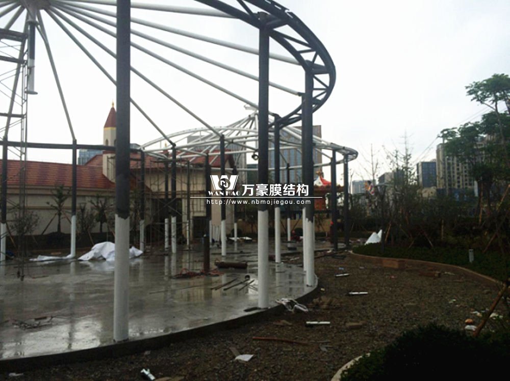 舟山東港兒童樂園膜結構工程坐落于舟山群島東南部的普陀區唯一一家大型兒童戶外游樂場所──東港兒童樂園之內。工程結構形式為張拉式,膜屋面投影面積為1458.53平方米??偯娣e為1648.19平方米,其中屋面展開面積為1527.13平方米,裙擺展開面積為121.06平方米。