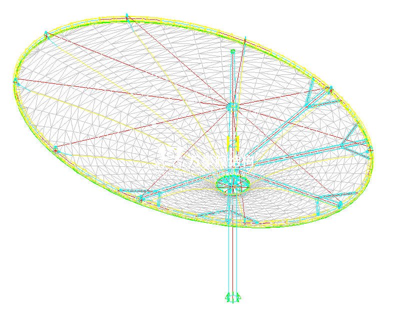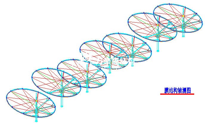 主要材料規格為:基礎為¢960*20柱腳底板,主立柱¢700*16,中間灌C35的膨脹混凝土,錨栓為¢20,鋼架主要材料為:¢165*5、¢114*4、¢325*10、¢219*6,鋼管材質為Q235B,鋼索采用¢20、¢32鍍鋅鋼索,采用法拉利1502t2膜材。