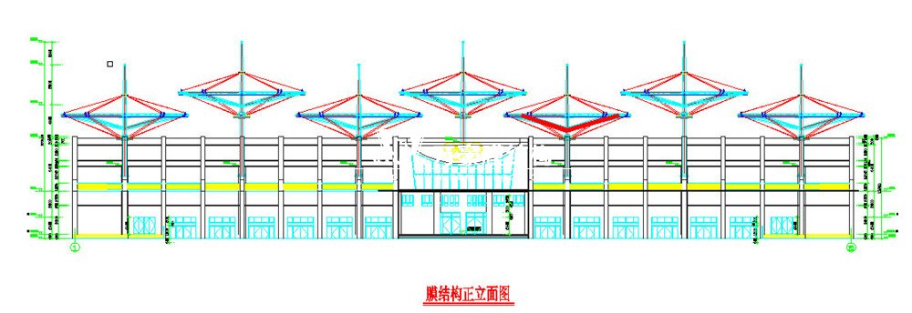 膜結構工程簡介:膜結構雨棚位于室外看臺A-E軸/1-20軸區域。膜結構雨棚采用張拉索膜結構,膜材采用進口法拉利1502t2膜材,雨棚柱頂標高32.643米,由7個長30.08米,寬17.38米的倒傘形狀的單體組成。
