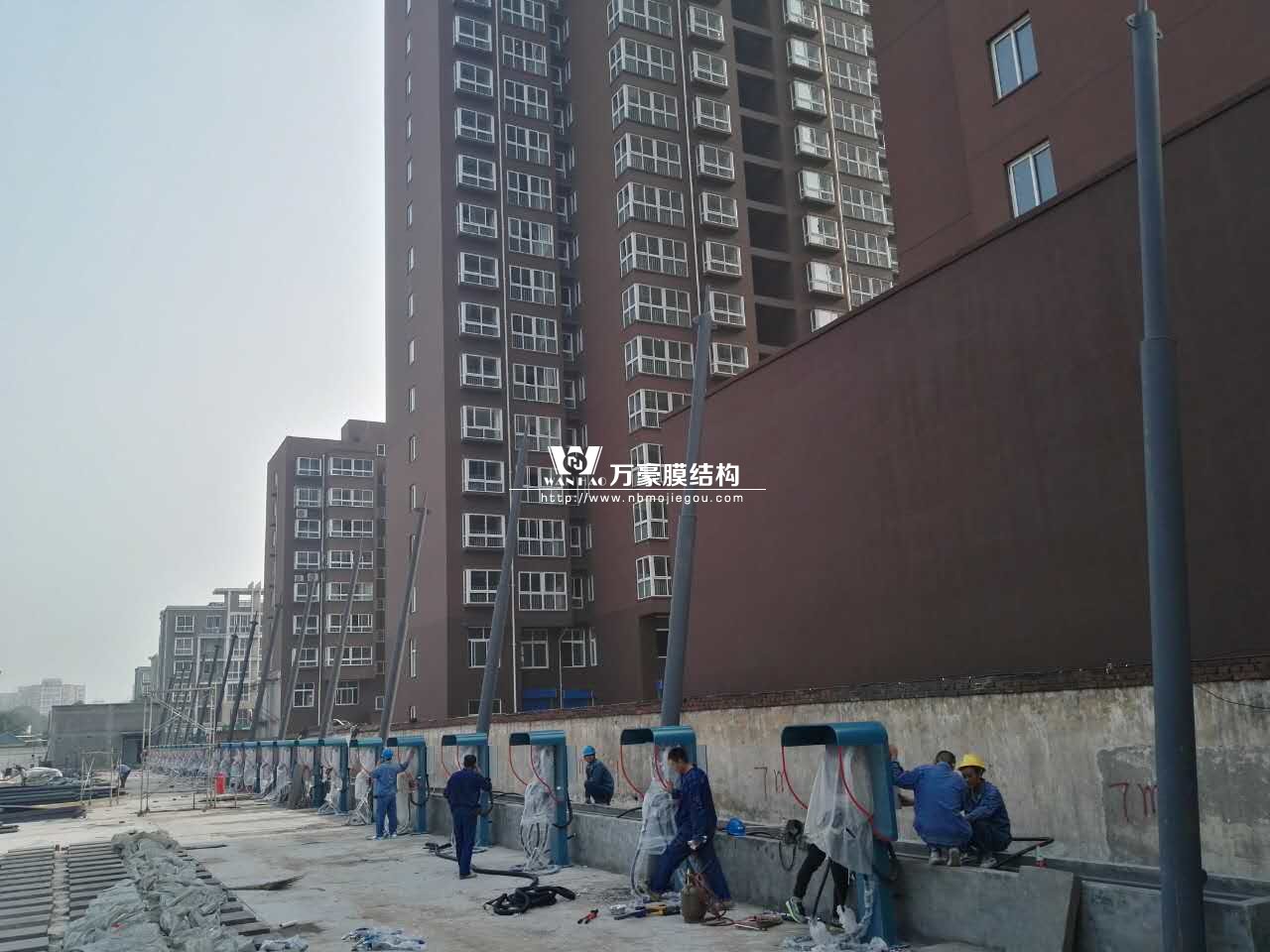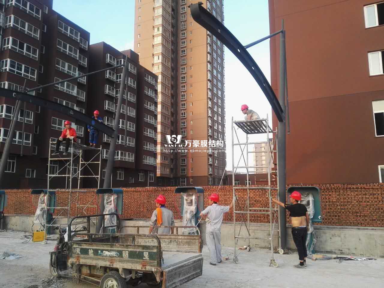 河南省新能源充電樁雨棚項目由我司與政府對接,項目正在緊張有序的施工中。該項目是專門為時下新型的充電汽車配置的充電樁雨棚,項目共計500個充電樁雨棚。現場近百人交叉施工, 面積約3萬平方米,采用PTFE 膜材覆蓋。