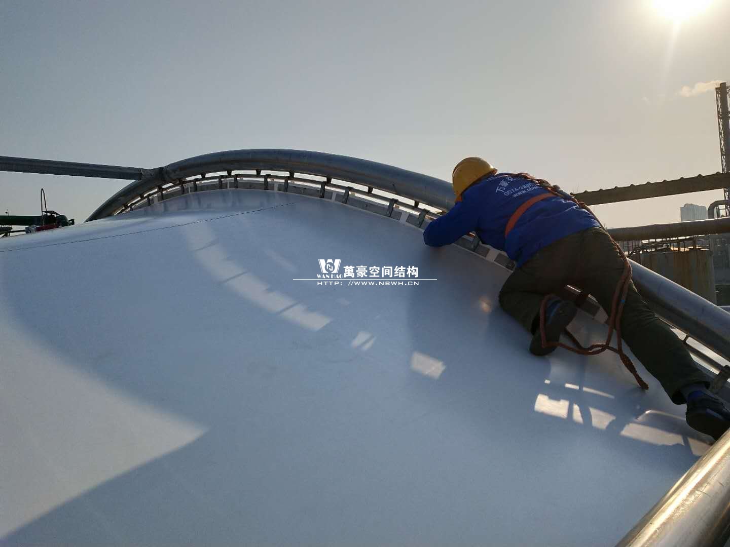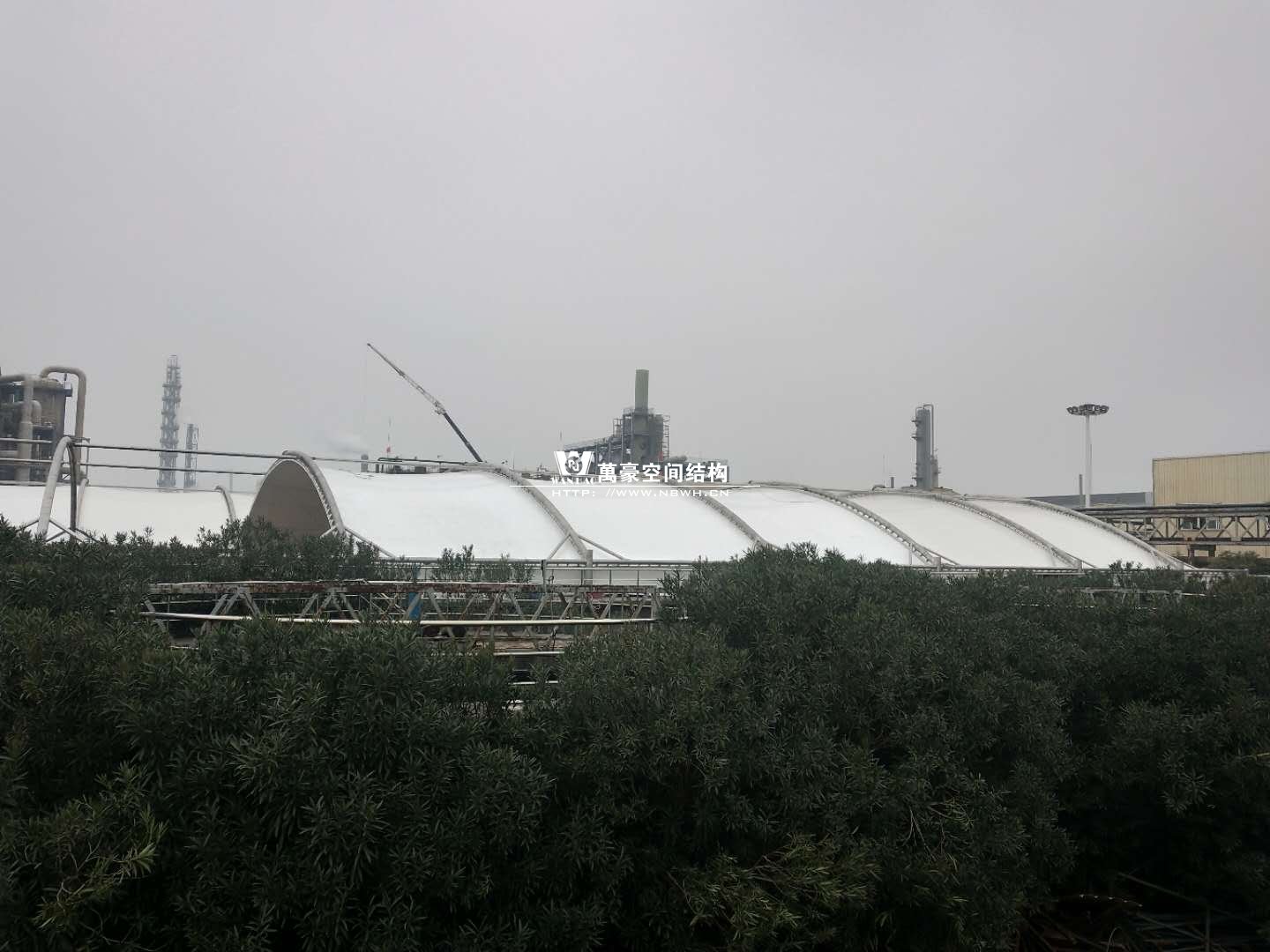 東廠區(qū)生化池加蓋工程,坐落于浙江省紹興市杭州灣上虞經(jīng)濟開發(fā)區(qū)龍盛科技園內(nèi)。整個項目由A/O池加蓋4座、二沉池加固定蓋4座、濃縮池加蓋2座、氧化池加蓋1座、氧化氣浮池加蓋1座、氧化集水池加蓋1座、出水調(diào)節(jié)池1座、安諾池1座,共計15座鋼膜結(jié)構(gòu)組成。總用鋼量達350噸,總建筑面積達35000平方米。