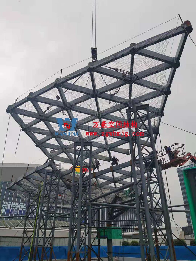 本工程鋼結構為單層雙曲網殼結構體系,平面上為對稱結構,大翅膀長跨約 50m,短跨約 25m,小翅膀長跨約 35m,短跨方向約 15m。建筑頂面為雙曲造型,建筑物最高點標高約17米。總用鋼量800噸,膜體總面積約7000平方米。
