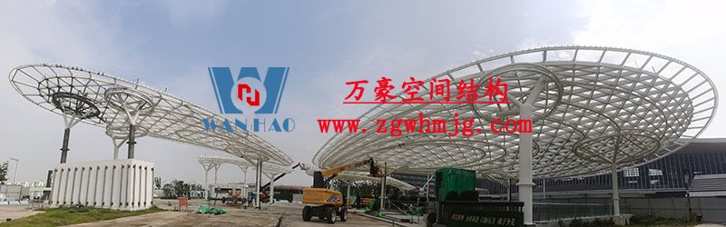 本工程鋼結構為單層雙曲網殼結構體系,平面上為對稱結構,大翅膀長跨約 50m,短跨約 25m,小翅膀長跨約 35m,短跨方向約 15m。建筑頂面為雙曲造型,建筑物最高點標高約17米??傆娩摿?00噸,膜體總面積約7000平方米。