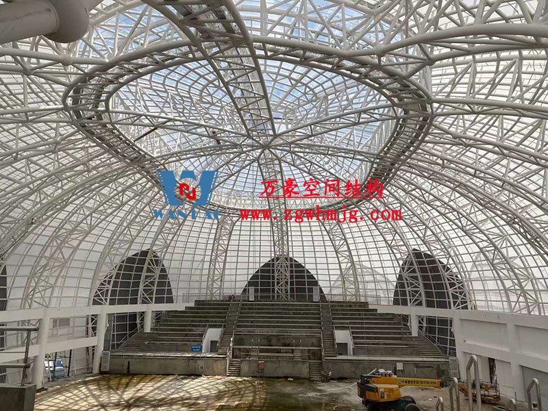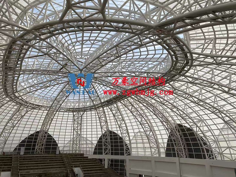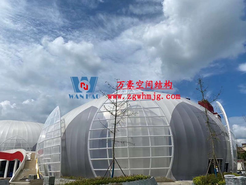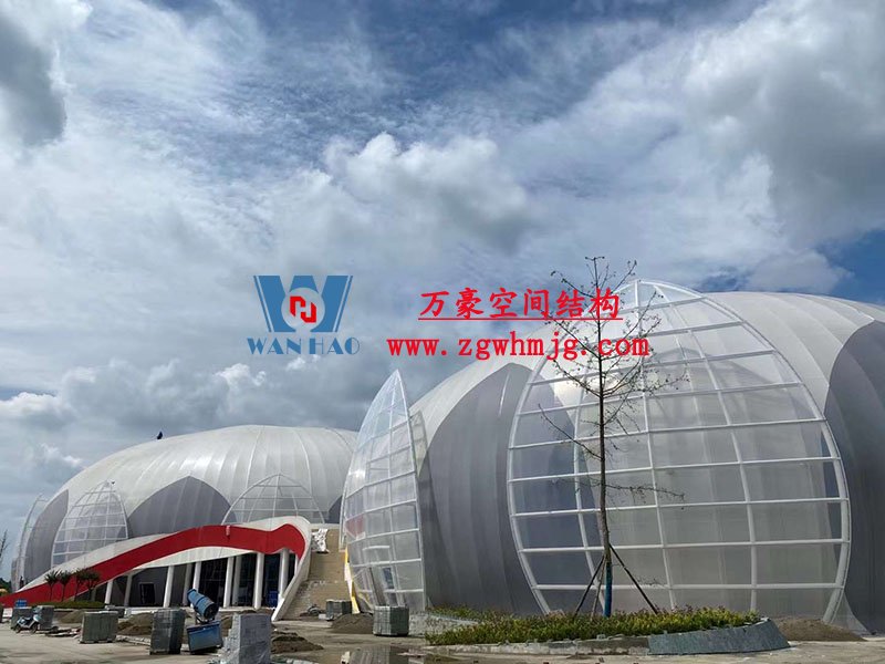 全封閉籃球館和多功能館結構部分采用了部分珩架與單層雙曲面網殼組合,屋面膜選用了不同顏色不同材質組合構成了含苞待放的花朵,項目落成后將為當地體育活動增添活力。