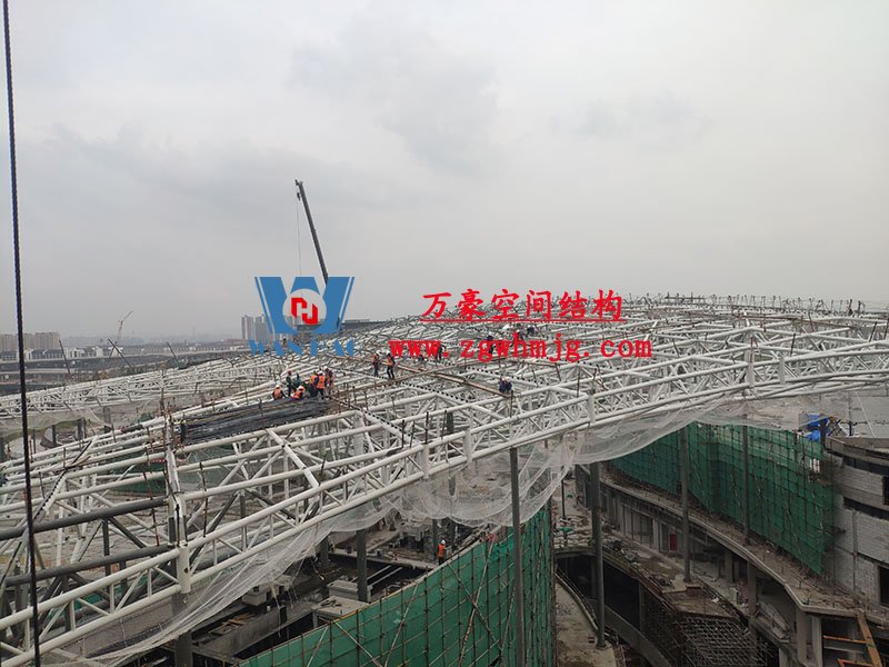 項目一共分六區,目前,一區鋼構件安裝完成,二區拉膜板安裝完成,拱桿完成50%。整體拱桿安裝完成45.6%,拉膜板安裝完成53.6%。