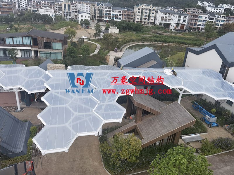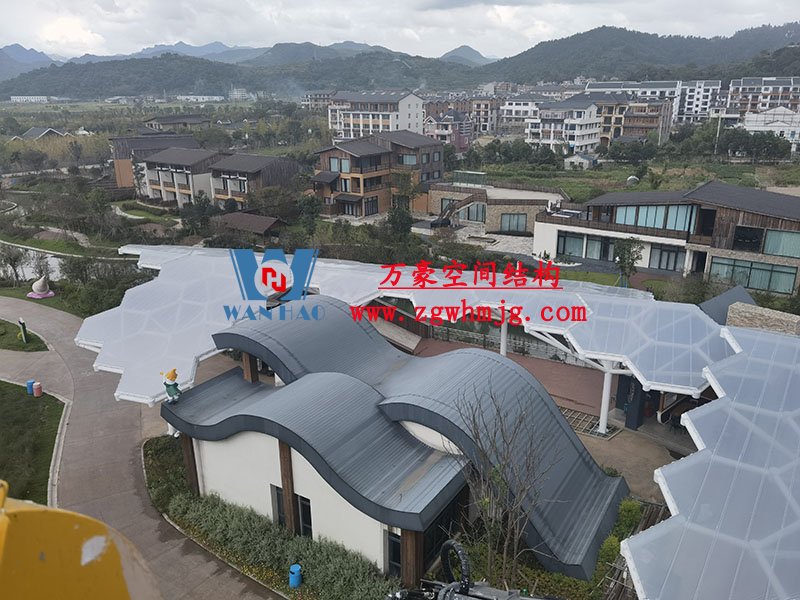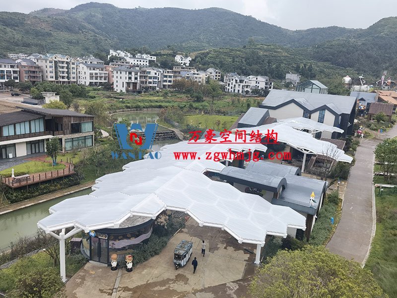 樂清鐵定溜溜樂園膜結構工程位于浙江省溫州市樂清市,項目鋼膜結構雨棚包括6號商業街蜂窩狀ETFE膜結構、檢票口PTFE膜結構、售票口PVDF膜結構。