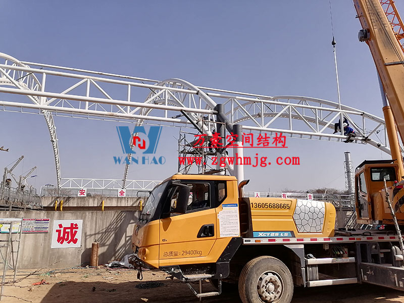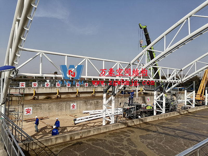 目前,進水口、粗格柵、細格柵、厭氧池兩個池子鋼結構都已完成 ,厭氧池立面膜已張拉,開始裝側面膜,南區氧化溝三個主桁架完成 ,準備進行下一步施工。
