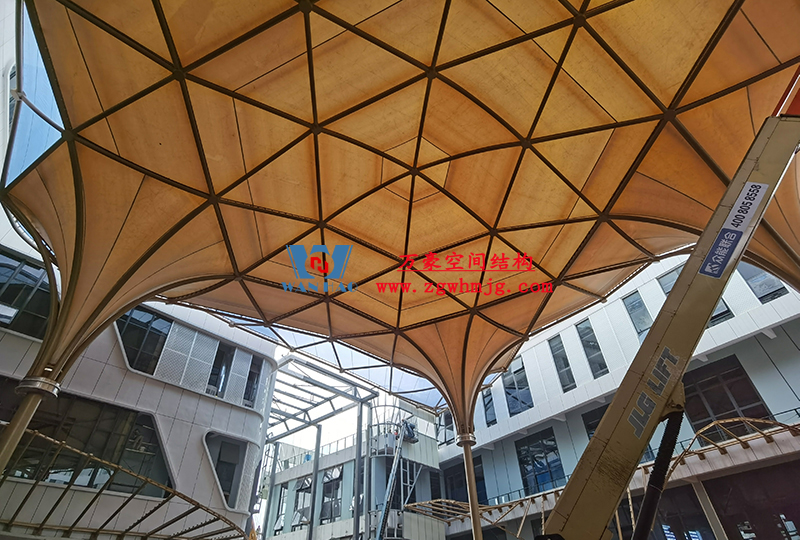 ptfe膜結構適用與商業天幕,體育場館,機場,高鐵站等大跨度結構或造型多變的雙曲面結構,常用于屋面圍護結構,其特點材質輕盈受張拉強度高,表面自潔性能好,有相對的透光率,對于傘狀反吊模式的安裝常見于膜面在底下,結構在上層。