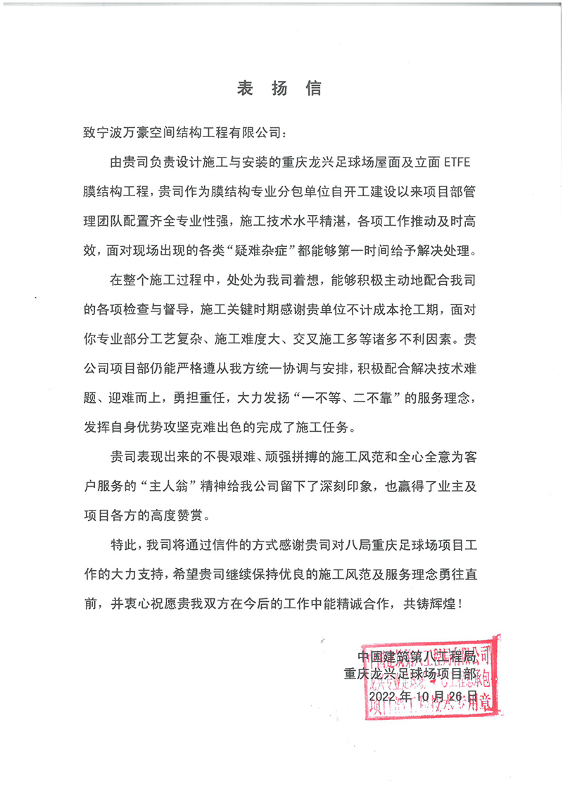 祝賀“我司重慶龍興足球場屋面及立面ETFE膜結構工程榮獲定制錦旗和表揚信”